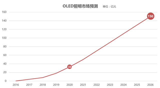 照明一直被認為是發(fā)展非常緩慢的行業(yè),直到20世紀90年代LED、OLED的出現(xiàn),才正式拉開了現(xiàn)代照明發(fā)展的序幕。此后,OLED照明在全球照明市場中的占有率開始逐年增長,據(jù)IDTechEX預(yù)估,2026年OLED照明市場將達到150億元(約22億美元)。