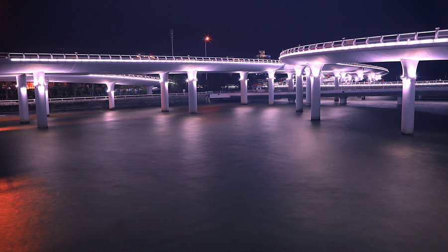 )位于廈門環(huán)島路海軍碼頭-演武路-白城段,全長2.2公里,由主橋體、成功大道互通立交、演武互通立交和白城互通立交組成。橋梁建設(shè)總投資5.6億元,于2003年9月通車。在結(jié)構(gòu)上采取了魚腹式梁,橢圓型墩,橋身通體漆為白色。